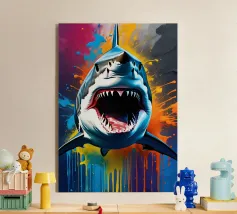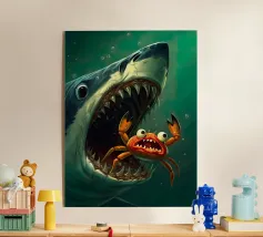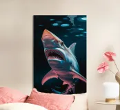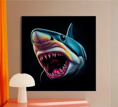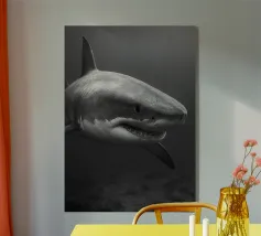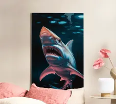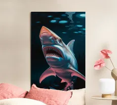 Questa opera d'arte sbalorditiva presenta un'interpretazione surreale e iperrealistica di uno squalo che domina le profondità dell'oceano. I suoi denti affilati scintillano sotto la debole luce delle profondità marine, esaltando il suo aspetto minaccioso. Il gioco di riflessi sulla superficie dell'acqua e il movimento dei pesci più piccoli sullo sfondo aggiungono un ulteriore livello di realismo. La prospettiva fa apparire lo squalo ancora più grande, come se stesse emergendo dall'oscurità, pronto a colpire. Questo pezzo è un capolavoro artistico, che fonde realismo ed esagerazione creativa per rappresentare la cruda bellezza del più grande predatore del mare.