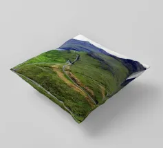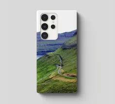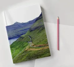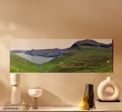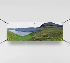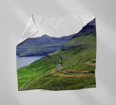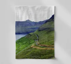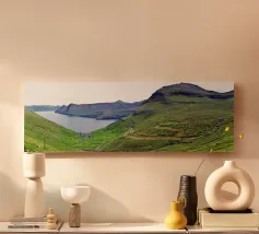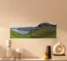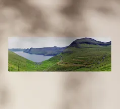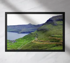 Come la coda di un drago verde addormentato, una strada stretta si snoda verso un regno nascosto. Questa fotografia panoramica mozzafiato cattura il paesaggio epico e mitico delle Isole Faroe. Un minuscolo villaggio è adagiato sul fiordo immobile, sovrastato dalle immense montagne color smeraldo che lo circondano. Testimonianza delle dimensioni impressionanti della natura e del fascino dei luoghi remoti, quest'opera è un viaggio in un unico fotogramma. Portate lo spirito selvaggio e maestoso di questo paesaggio leggendario nella vostra casa.