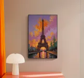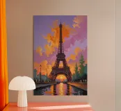 Questo dipinto a olio impressionista mostra la Torre Eiffel in uno splendido spettacolo di tonalità arancione e lavanda. La scena cattura la transizione tra il giorno e la notte, dove il sole scende sotto l'orizzonte, proiettando un bagliore dorato su Parigi. Il riflesso sul canale aggiunge profondità, creando una miscela armoniosa di acqua e cielo. Pennellate decise e texture ricche esaltano la tavolozza vivace, mentre i pedoni sparsi aggiungono vita alla scena. Un tributo quintessenziale alla bellezza della Torre Eiffel e dei tramonti parigini.