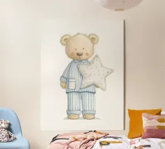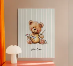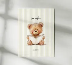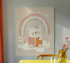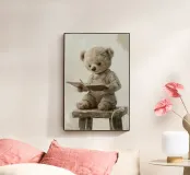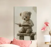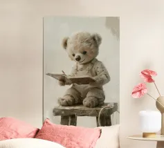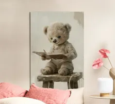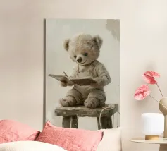 A soft beige bear in cozy overalls sits on a rustic stool, gently holding an open book with a little pencil in hand. With kind eyes and a peaceful smile, this clean and painterly illustration inspires the joy of learning. Rendered in creamy tones and vintage textures, it’s perfect for a warm, storybook-style children’s decor.