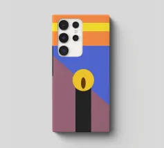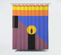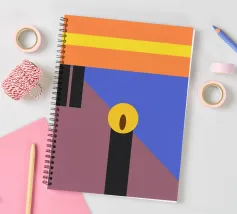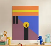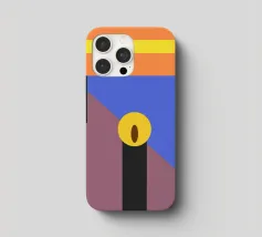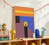 Forme geometriche audaci in colori contrastanti creano una composizione minimalista. Le tonalità dominanti sono arancione, blu e marrone, con elementi verticali neri e un ovale centrale giallo.