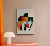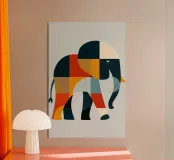 Un elefante astratto che prende vita con audaci blocchi di colore e armonia geometrica. Questa opera d'arte moderna e giocosa fonde l'estetica di metà secolo con la meraviglia infantile, creando un pezzo che sembra allo stesso tempo nostalgico e fresco. Ideale per le stanze dei bambini, per gli uffici creativi o per gli amanti del design animale minimalista.