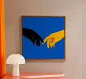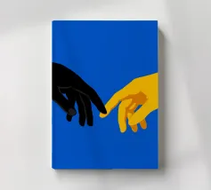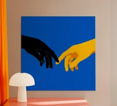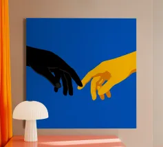 Scoprite una rivisitazione contemporanea di un capolavoro senza tempo con "The Modern Connection". Questa suggestiva illustrazione digitale reinterpreta il gesto iconico de "La creazione di Adamo" attraverso una lente audace e minimalista. Con due mani, una di un nero intenso e l'altra di un giallo dorato brillante, che si protendono l'una verso l'altra su uno sfondo blu elettrico vivido, quest'opera esplora i temi dell'unità, della dualità e della connessione umana.