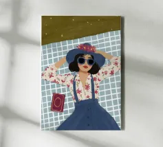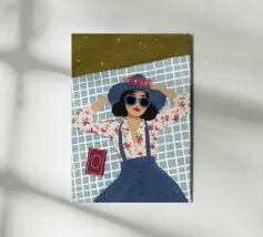Donna sdraiata su una coperta da picnic in un prato. Accanto a lei un libro. La stampa ha un aspetto retro/vintage.