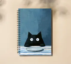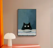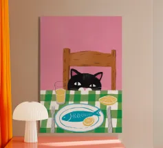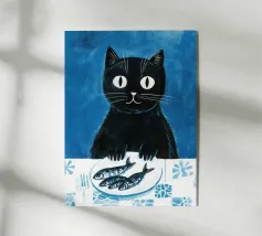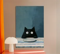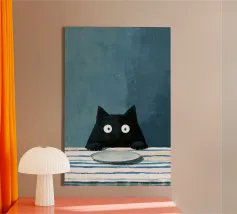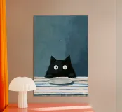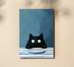 Quest'opera esplora l'immobilità e l'attesa attraverso una composizione pittorica minimalista. Il gatto nero, reso con pennellate strutturate e contrasti netti, diventa un punto focale di tranquilla tensione. I suoi occhi ampi e luminosi introducono un'immediatezza emotiva, mentre la tavolozza contenuta di blu profondi, creme tenui e neri antracite crea equilibrio visivo e calma. Il piatto vuoto funziona come un'ancora simbolica che suggerisce un'anticipazione, un desiderio o una narrazione sospesa, senza una narrazione esplicita. Le trame pittoriche visibili e le forme semplificate enfatizzano la materialità e il ritmo, fondendo le due cose.