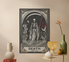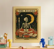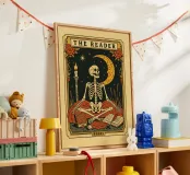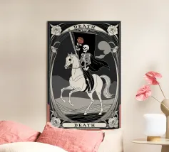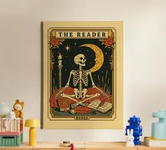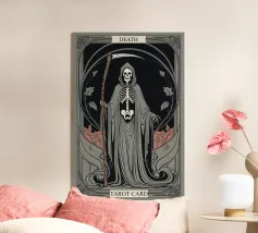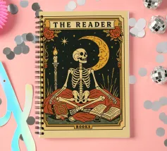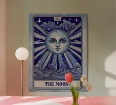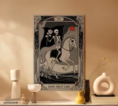 Tarocco vintage di uno scheletro che legge sotto la luna crescente.
