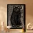 Un mistico gatto nero siede sotto una luna crescente, circondato da motivi vorticosi e trame intricate. L'opera d'arte in stile linoleografico evoca un'aria di mistero e magia, fondendo la natura e la notte in una composizione accattivante.