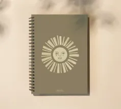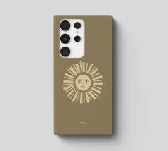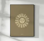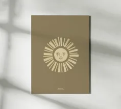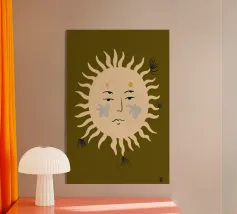 Una figura solare astratta con uno sguardo pacifico in toni caldi di giallo chiaro su uno sfondo color oliva.