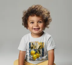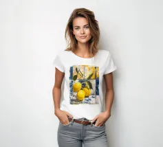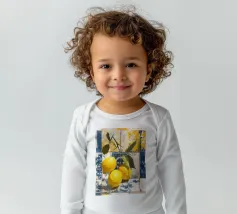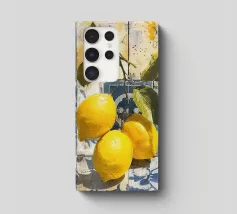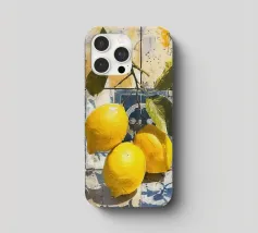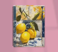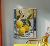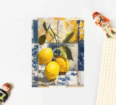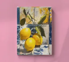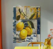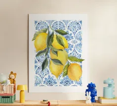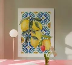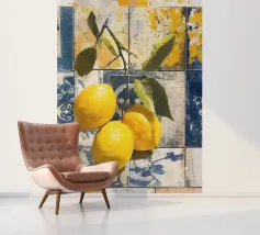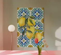 Tre limoni gialli brillanti pendono da un ramo con foglie verdi su uno sfondo di piastrelle a fantasia. Le piastrelle presentano un mix di tonalità blu e gialle con disegni floreali e astratti.