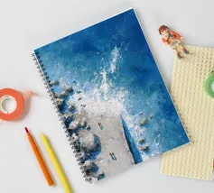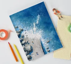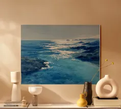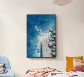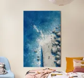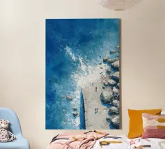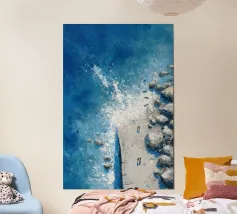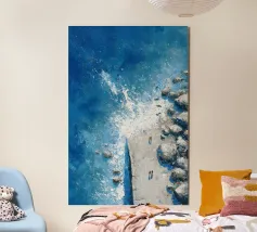 Questa opera d'arte cattura un drammatico momento aereo in cui le potenti acque blu si scontrano con uno stretto sentiero costiero scavato nella roccia. Le texture spesse ed espressive trasmettono l'energia del mare, mentre gli schizzi di schiuma bianca creano un contrasto sorprendente con il blu profondo. Le piccole figure umane che camminano lungo il bordo sottolineano la scala e la vulnerabilità, trasformando la scena in una tranquilla meditazione sull'equilibrio tra movimento e immobilità. Mescolando astrazione e realismo, la composizione evoca la contemplazione, la resilienza e l'attrazione senza tempo della costa, ideale per gli interni moderni e per le finiture di grande formato.