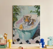 Una tigre in una vasca da bagno simboleggia la capacità di rilassarsi e lasciarsi andare. La scena mostra che anche gli esseri più forti hanno bisogno di rilassarsi per rimanere al massimo delle loro forze. Ci ispira a non lasciarci dominare dallo stress. Dopo tutto, chi si concede un po' di riposo affronta ogni sfida con rinnovato vigore. Un quadro pieno di leggerezza, profondità e serenità.
