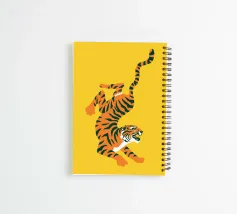 Una tigre stilizzata è raffigurata in una posa dinamica e giocosa. Le strisce arancioni e nere della tigre spiccano con forza, creando un contrasto visivo di grande effetto.