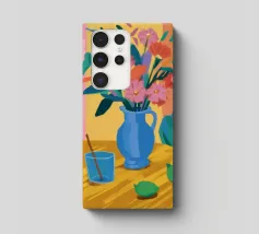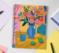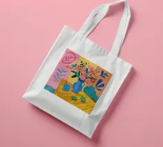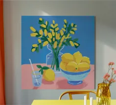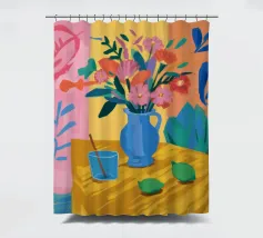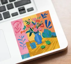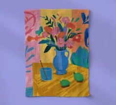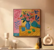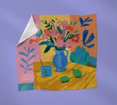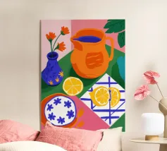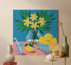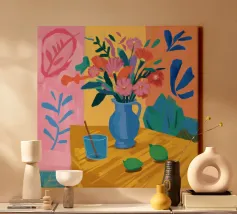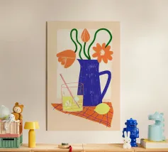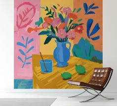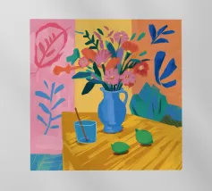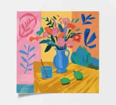 Una moderna natura morta di un bouquet di fiori rosa e arancioni in un vaso blu. Due lime verdi si trovano sul tavolo, aggiungendo un tocco di freschezza a questa composizione vivace e colorata.