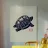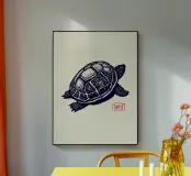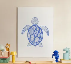 Una dettagliata illustrazione in bianco e nero di una tartaruga con un intricato disegno a linee, su un morbido sfondo beige. Un timbro rosso con la parola "Turtle" aggiunge un raffinato tocco artistico.