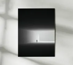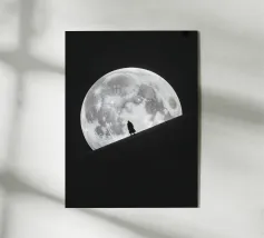 Questa illustrazione digitale in bianco e nero presenta un paesaggio spaziale astratto, dove un gruppo di figure cammina su una superficie d'acqua riflettente che si estende all'infinito sotto un vasto cielo pieno di stelle. L'acqua serena crea un terreno a specchio, amplificando la bellezza surreale della scena mentre le figure attraversano questo mondo alieno. In lontananza, un'enorme luna nera incombe minacciosa, proiettando la sua ombra sull'orizzonte e aggiungendo un senso di mistero al tranquillo viaggio. Il netto contrasto tra luce e buio crea un'atmosfera eterea, che evoca sentimenti di solitudine e soggezione di fronte all'incertezza di una persona.