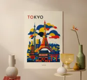 A bold, graphic celebration of Tokyo, where tradition and modernity meet through clean geometry and confident colour blocking. Iconic city landmarks are layered into a dynamic skyline, balancing historic forms with contemporary structures to reflect Tokyo’s unique rhythm and scale. The composition feels energetic yet ordered, capturing the city’s intensity without visual clutter.