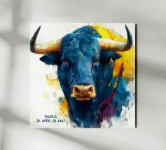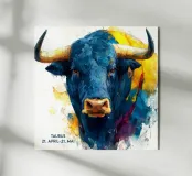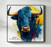 Il segno zodiacale Toro (in latino Taurus) è caratterizzato da qualità come la concretezza, la perseveranza, la lealtà e un forte senso del piacere. In quanto segni di terra, i Toro cercano sicurezza e stabilità, sono noti per essere pratici e scrupolosi e apprezzano il comfort e le cose belle della vita. Tuttavia, possono anche essere considerati testardi e possessivi, che si attengono alle loro decisioni finché non sono convinti. Un Toro dipinto in stile acquerello per la vostra parete o come bellissimo regalo per i vostri cari.