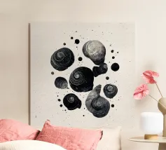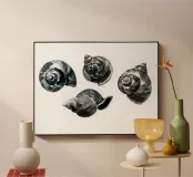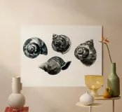 Quattro conchiglie simili a lumache si arricciano con elegante precisione, ognuna distinta nel disegno ma unificata dalla tavolozza monocromatica. Con pennellate fluide e un morbido contrasto tonale, la composizione celebra la tranquilla geometria delle forme a spirale della natura.