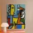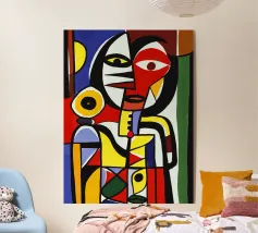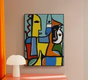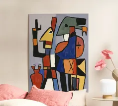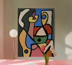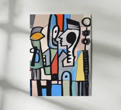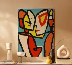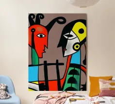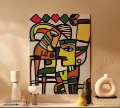 Due figure stilizzate dominano la composizione, caratterizzate da forme astratte e colori vivaci. Una figura appare di profilo mentre l'altra è rivolta in avanti, entrambe con tratti esagerati e una qualità stravagante.