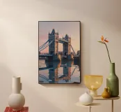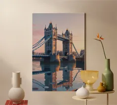 Una vista ipnotica del Tower Bridge di Londra, che si riflette perfettamente sulle acque calme del Tamigi durante l'alba. Il cielo passa dal rosa pastello alle tonalità dorate, illuminando gli intricati dettagli del design del ponte. Questa immagine cattura l'armonia tra architettura urbana e natura, dove la quiete del mattino esalta la bellezza iconica di questo storico punto di riferimento. Una vera rappresentazione del patrimonio londinese e dell'affascinante serenità delle prime ore in riva al fiume.