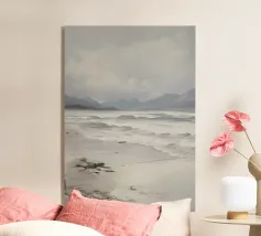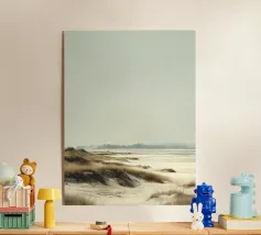 Un momento di tranquillità su un'ampia spiaggia irlandese - la luce è morbida, i colori sobri ma tangibili: il beige pallido della sabbia bagnata, il verde tenue delle dune, il cielo grigio-azzurro in alto. Un pezzo di legno alla deriva riposa in primo piano, apparentemente perso, ma completamente in armonia con la scena. Questo quadro vive grazie ai suoi colori tenui e alla sua profondità atmosferica: un omaggio ai toni pacati della natura.