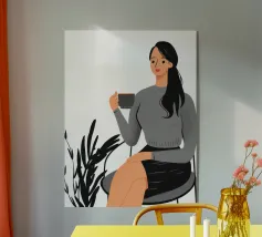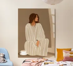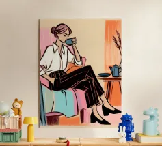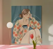 Il dipinto raffigura una persona seduta comodamente, con in mano una tazza di tè. L'abbigliamento a motivi floreali e l'espressione calma trasmettono un senso di tranquillità e relax.