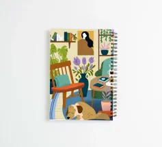 Quest'opera d'arte cattura uno spazio interno sereno con una sedia a dondolo, un cane che dorme e varie piante. Una tazza di tè e un libro su un tavolino arricchiscono il rifugio accogliente e tranquillo.
