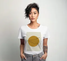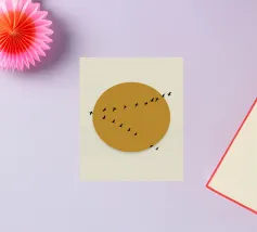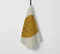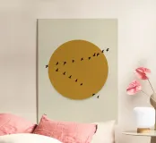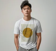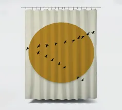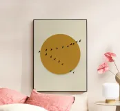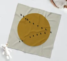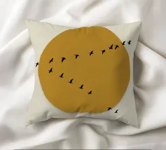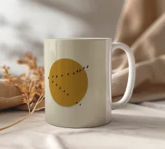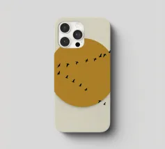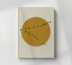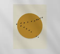 Questa illustrazione grafica cattura la bellezza ritmica della migrazione degli uccelli attraverso una lente minimalista, sullo sfondo di un sole ocra centrale e un campo neutro dalla trama simile al lino. La formazione precisa delle sagome crea un'armonia geometrica equilibrata che simboleggia la direzione collettiva e i cicli naturali.