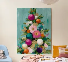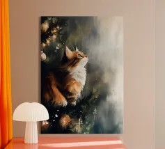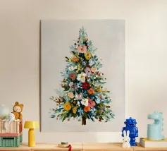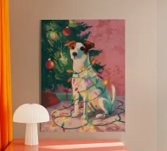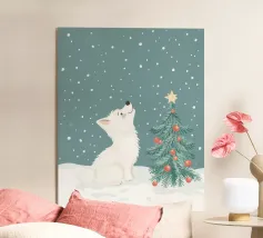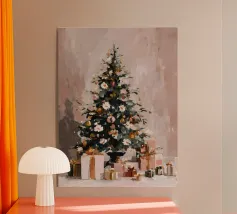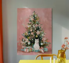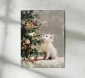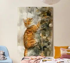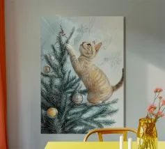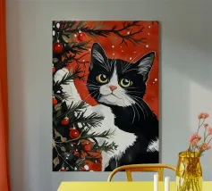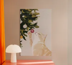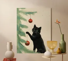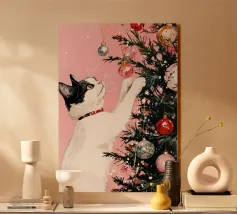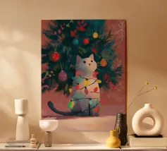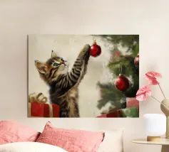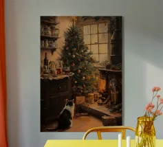 Stampa artistica da parete del gattino di Natale con albero e regali - un'accogliente decorazione festiva per gli amanti degli animali e gli appassionati del Natale.