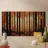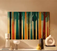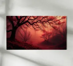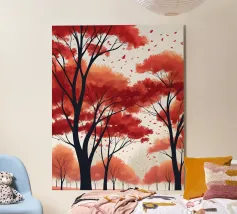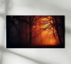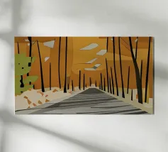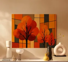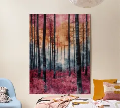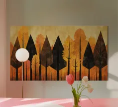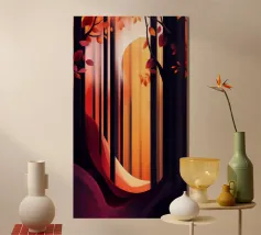 Il dipinto digitale di una foresta autunnale presenta sagome scure di alberi su uno sfondo caldo e dorato. L'opera d'arte testurizzata mostra un fogliame dettagliato nei toni dell'arancione e del marrone, creando una scena di bosco serena e suggestiva.