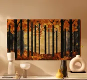 Una splendida rappresentazione astratta di una foresta autunnale con alti tronchi scuri e fogliame dorato. Lo sfondo caldo e luminoso esalta la composizione geometrica, creando un'atmosfera serena e moderna.