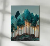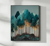 Un paesaggio da sogno dove colore, luce e forma si fondono in una tranquilla armonia. Sottili tronchi d'albero si ergono da uno sperone roccioso, sostenendo una fitta chioma dai toni delicatamente cangianti che brillano dall'interno. La luce che filtra attraverso la foresta crea un senso di calore e di elevazione, trasformando la scena in qualcosa di naturale e ultraterreno.
