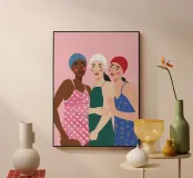 Un'illustrazione di tre donne diverse, vestite in modo elegante e unite in un abbraccio solidale. L'immagine è una bella e potente celebrazione dell'amicizia, dell'unità e della solidarietà femminile.