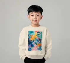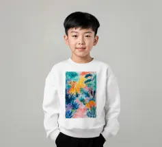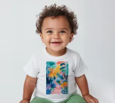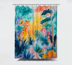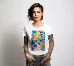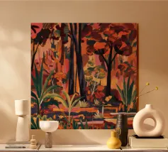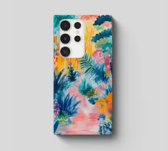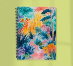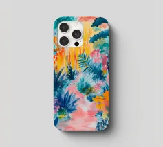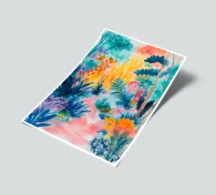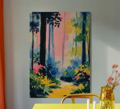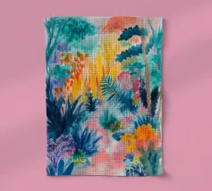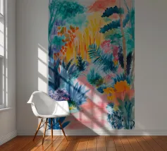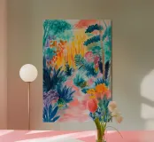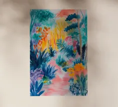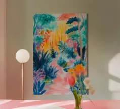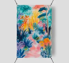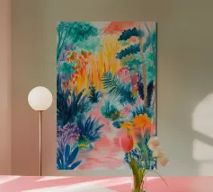 Un paesaggio vibrante e ricco di colori, con una vegetazione lussureggiante nelle tonalità del blu, del rosa, dell'arancio e del giallo. La scena suggerisce un ambiente tropicale stravagante sotto un cielo caldo e luminoso.