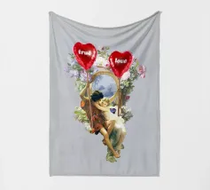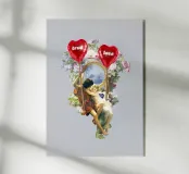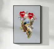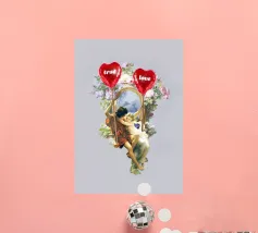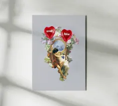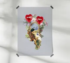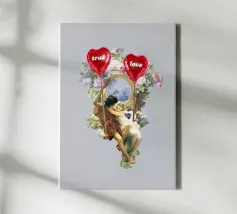 "Questo romantico collage combina l'eleganza di un dipinto neoclassico con elementi moderni, raffigurando una coppia di innamorati che si dondola su un'altalena ornata di palloncini. L'opera cattura l'essenza dell'amore e del romanticismo attraverso un delicato equilibrio tra classico e contemporaneo. I palloncini aggiungono un tocco di estro e fantasia, sollevando gli amanti in una scena onirica che evoca la gioia e la libertà del vero amore".