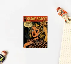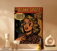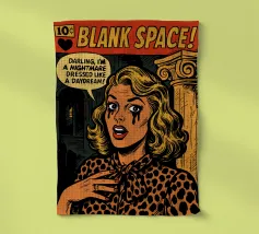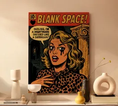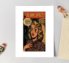 Blank Space Comic Book Cover | Taylor Swift Pop Art Poster | Retro Drama Wall Art “Got a long list of ex-lovers, they’ll tell you I’m insane…” Bring the drama to your walls with this digital pop art comic cover inspired by Taylor Swift’s “Blank Space.” This high-impact illustration transforms the iconic heartbreak anthem into a vintage comic book scene—complete with high-gloss lipstick, villain-era chaos, and a pen poised to write your name.