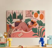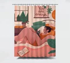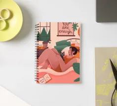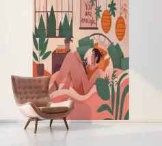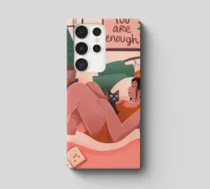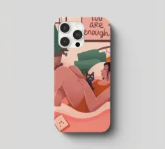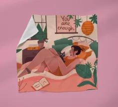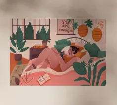 A person relaxes on a bed surrounded by plants and a banner that reads 'You are enough.' The tranquil atmosphere emphasizes self-acceptance and peace.