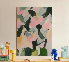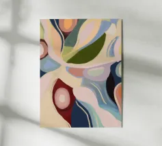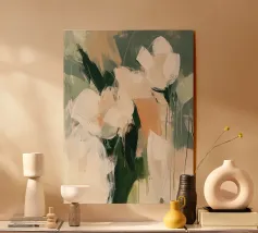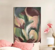 "Tulipano" è una composizione astratta lirica che affascina con pennellate morbide e organiche e una tavolozza di colori tenui. La forma centrale è rappresentata da una danza vorticosa di delicate sfumature di rosa, pesca e crema, incastonate in uno sfondo rilassante di verde oliva e rosso-marrone tenue. Lo stile pittorico è fluido e gestuale e crea un movimento delicato che ricorda gli eleganti petali di un tulipano. Questo pezzo trasmette uno stato d'animo calmo, femminile e sottile.