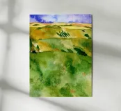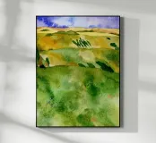 Tuscan Fields is a serene watercolor landscape inspired by the gentle rhythm of rolling hills and golden light. Soft washes of green and ochre capture the calm of open fields under a blue summer sky. This artwork brings a sense of space, harmony, and quiet joy — perfect for interiors that celebrate nature and simplicity.