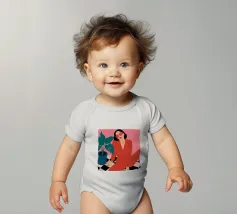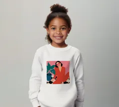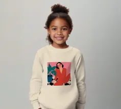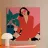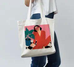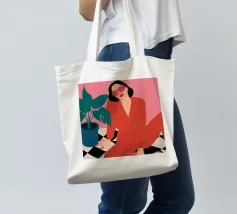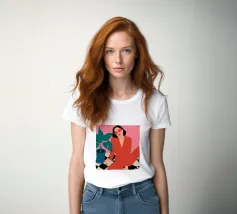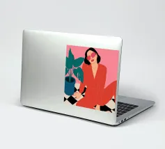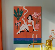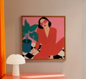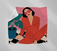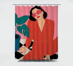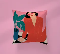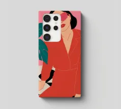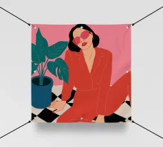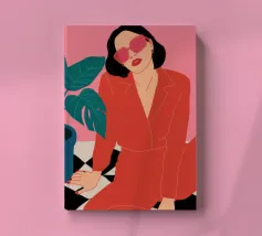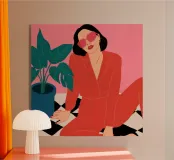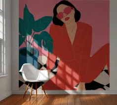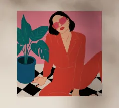 Una donna elegante con un'audace tuta rossa e occhiali da sole rosa posa con sicurezza accanto a una grande pianta di monstera. L'illustrazione è una dichiarazione vibrante e chic della moda moderna e dello stile degli interni.