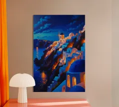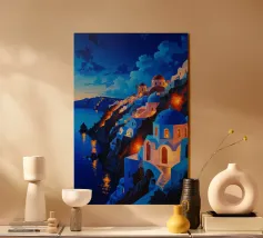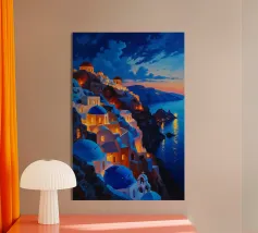Scoprite il fascino mozzafiato dell'iconica architettura imbiancata di Santorini mentre si crogiola nella calda luce dorata del crepuscolo. Adagiati sul bordo della caldera, i tetti a cupola e gli edifici a cascata si illuminano sullo sfondo del mare Egeo. Il drammatico gioco di luci e ombre esalta la scena, mentre il cielo limpido della sera si trasforma in tonalità più profonde. Questo incantevole panorama cattura il fascino senza tempo e la tranquillità di una delle destinazioni più romantiche del mondo, evocando un senso di meraviglia e di fuga.