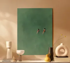 Nella vasta distesa turchese, due figure vanno alla deriva in silenziosa armonia, le loro sagome speculari e le dolci increspature tracciano un viaggio parallelo. Realizzato con olii audaci che catturano sia la fluidità dell'acqua che la quiete dei momenti condivisi, "Twin Reflections" evoca la serena connessione tra la presenza umana e il mare aperto.