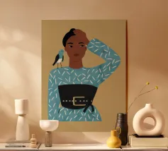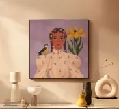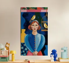 This painting features a person in a floral dress with a bird perched on the shoulder. The background is filled with large yellow flowers and a soft purple sky, creating a serene atmosphere.