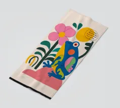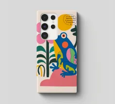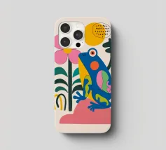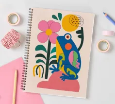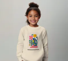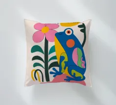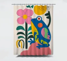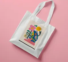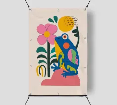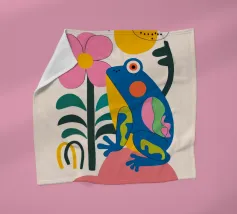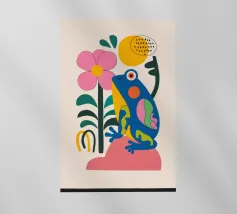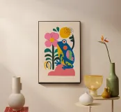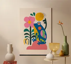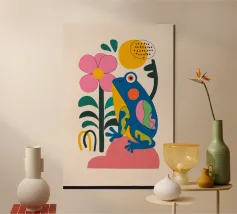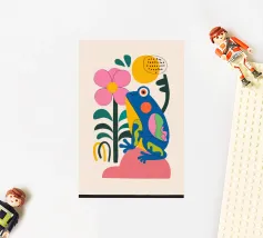 Un uccello dai colori vivaci appollaiato su un ramo accanto a un grande fiore rosa. Lo sfondo è pieno di fogliame e forme astratte.