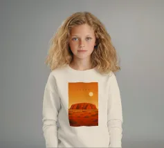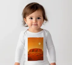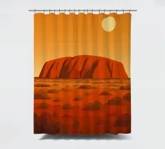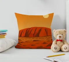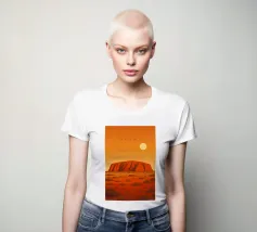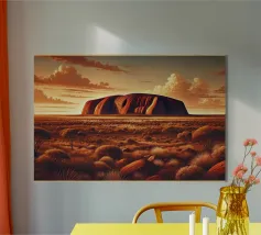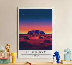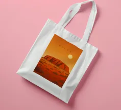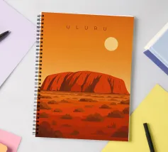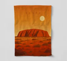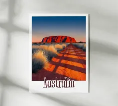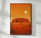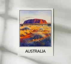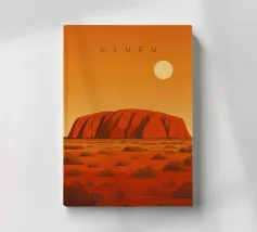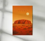 Minimalistisches Australien Reise-Design mit dem bekannten Felsen (Sandsteinmonolith) Uluru in australiens "Red center". Dieses typisch australische Landschaftsmotiv eignet sich perfekt für alle Australien-Reisenden, die die beeindruckende Landschaft Australiens lieben.