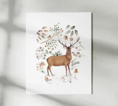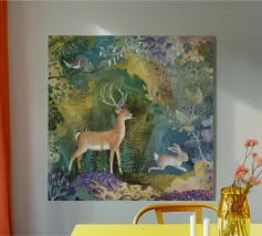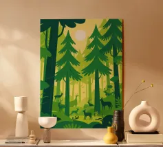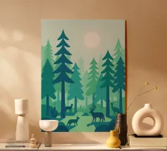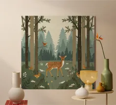 un cervo, uccelli e varie piante in una foresta con alberi ad alto fusto plexiglass