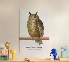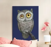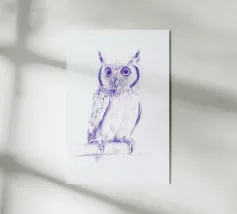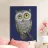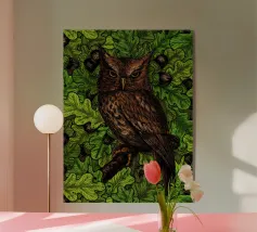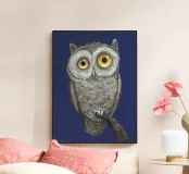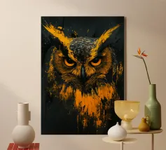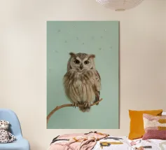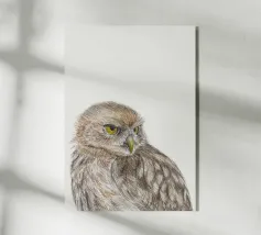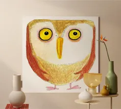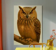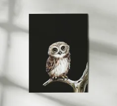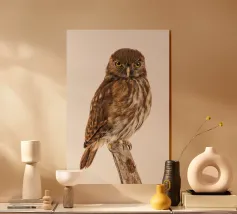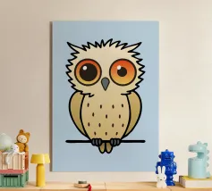 Un dipinto a olio di un gufo dall'aspetto simpatico e divertente. Si tratta di un uccello marrone chiaro con grandi occhi arancioni. Gli occhi del gufo sono un po' irregolari, il che lo fa sembrare ancora più buffo e dolce. Sembra anche un po' spaventato con i suoi occhi rotondi.