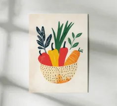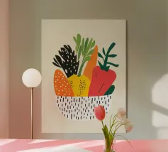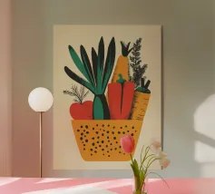 Una composizione moderna e vibrante che celebra la bellezza delle verdure. Forme astratte e colori vivaci conferiscono a questa illustrazione un'atmosfera calda e contemporanea. Perfetta per una cucina dinamica o per un interno vivace.