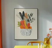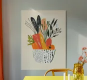Una composizione moderna e vibrante che celebra la bellezza delle verdure. Forme astratte e colori vivaci conferiscono a questa illustrazione un'atmosfera calda e contemporanea. Perfetta per una cucina dinamica o per un interno vivace.