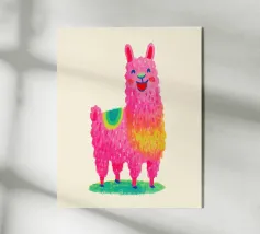 Un lama sorridente con sciarpa a righe colorate plexiglass